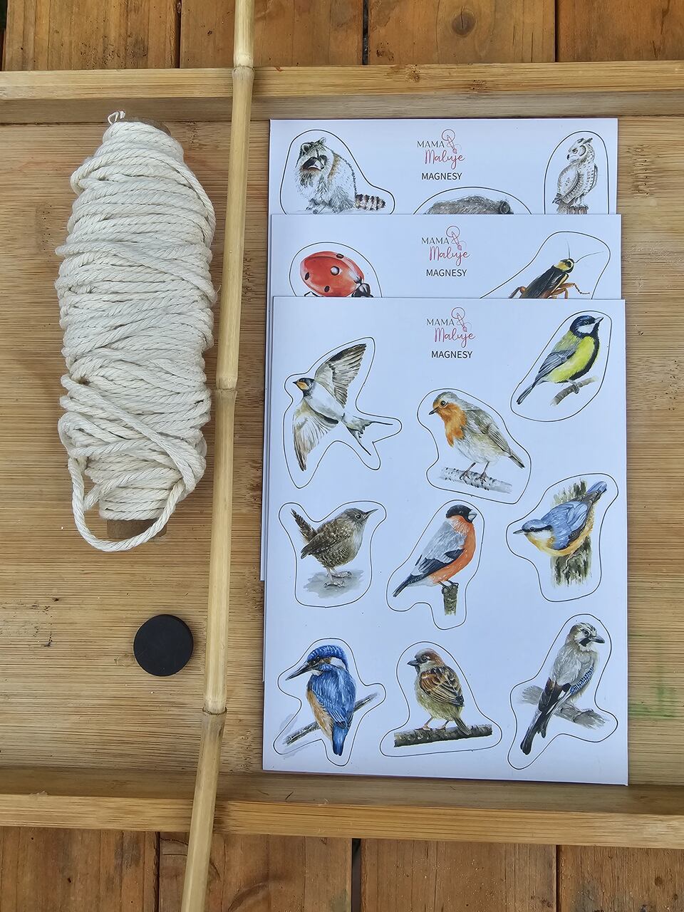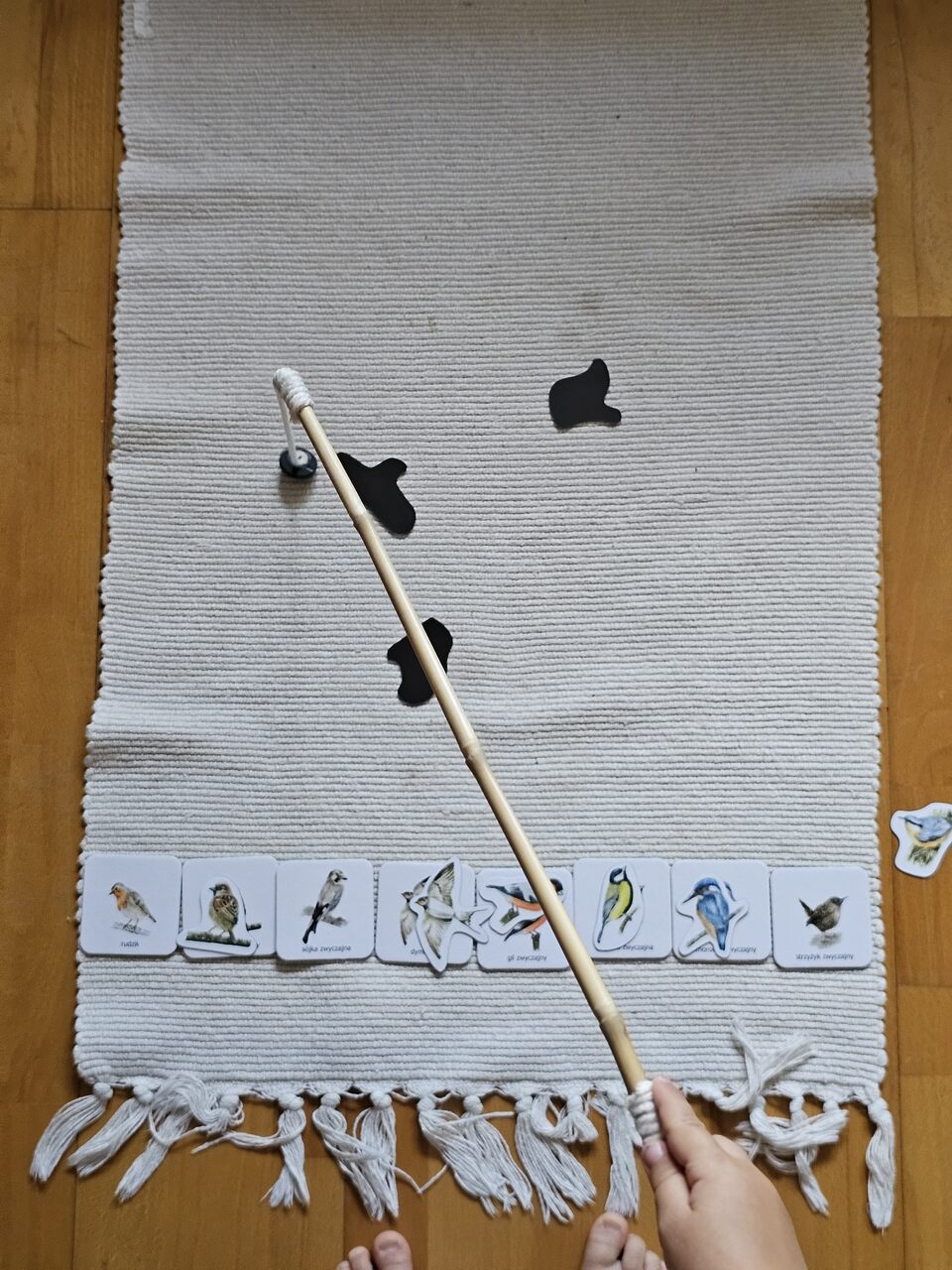 Na początek wybierzcie się na PTASIE ŁOWY. Rozłóż na podłodze magnesy „PTAKI”, obrazkiem do dołu. Zadaniem dziecka jest „złowić” wszystkie ptaki przy pomocy magnesu na wędce.
