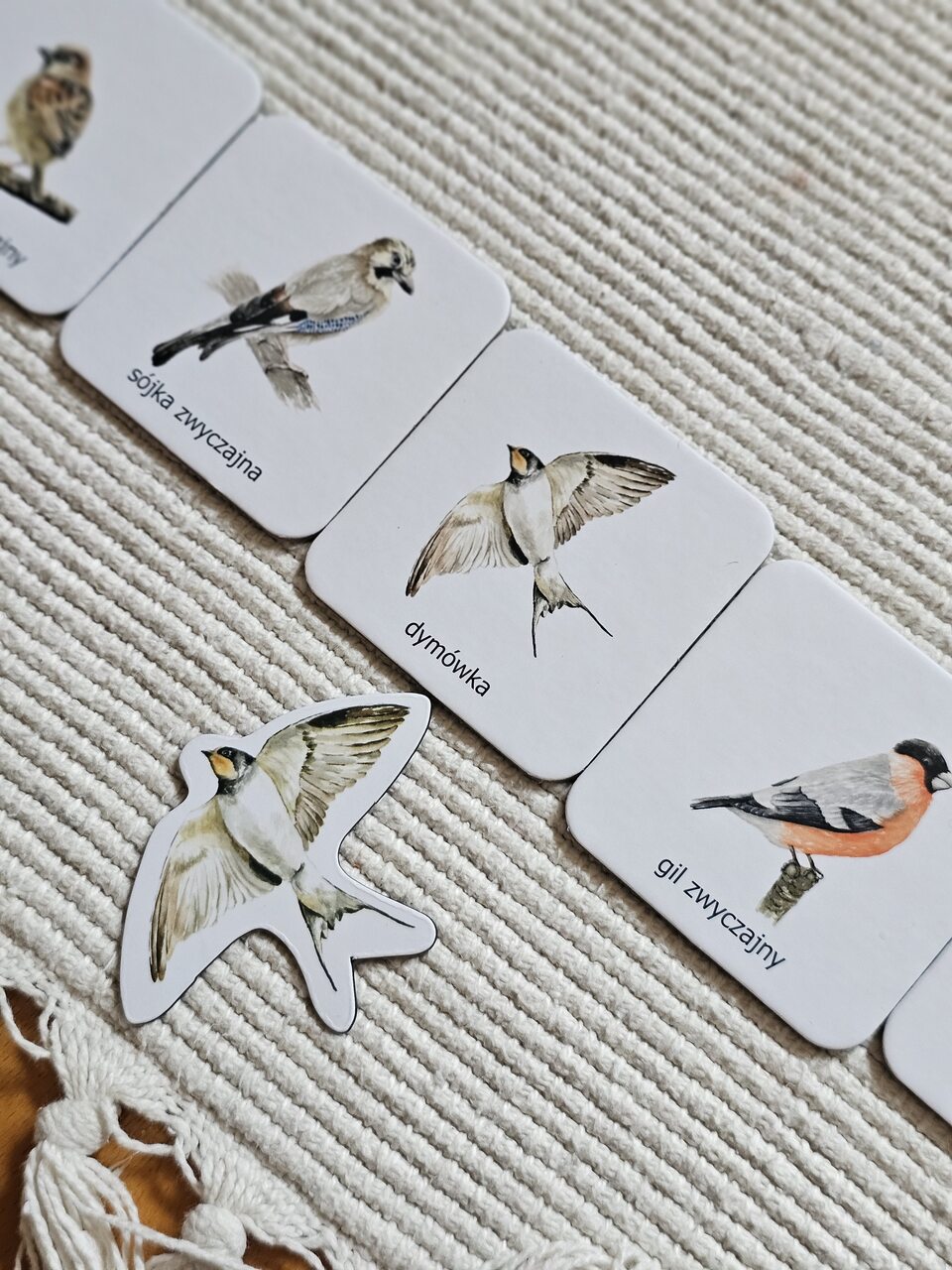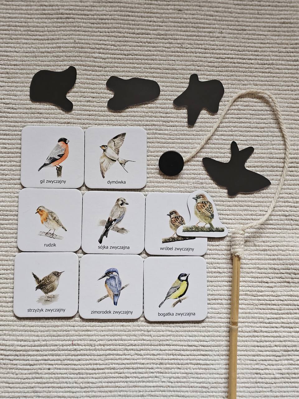 Gdy do zabawy włączycie grę MEMO „PTAKI” nabierze ona edukacyjnego charakteru: wybierz z gry kartoniki z ptakami, które odpowiadają tym z magnesów. Rozłóż je przed dzieckiem- jego zadaniem jest złowić ptaka i przyporządkować go do kartonika z taką samą ilustracją. Starsze dziecko może odczytać nazwę gatunku, młodsze – tylko przyporządkowuje, a Ty mówisz jak nazywa się ten ptak.