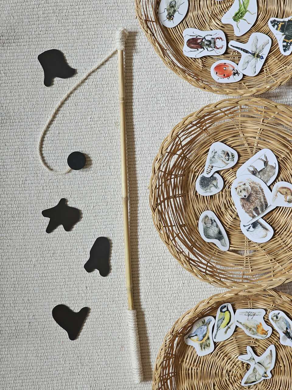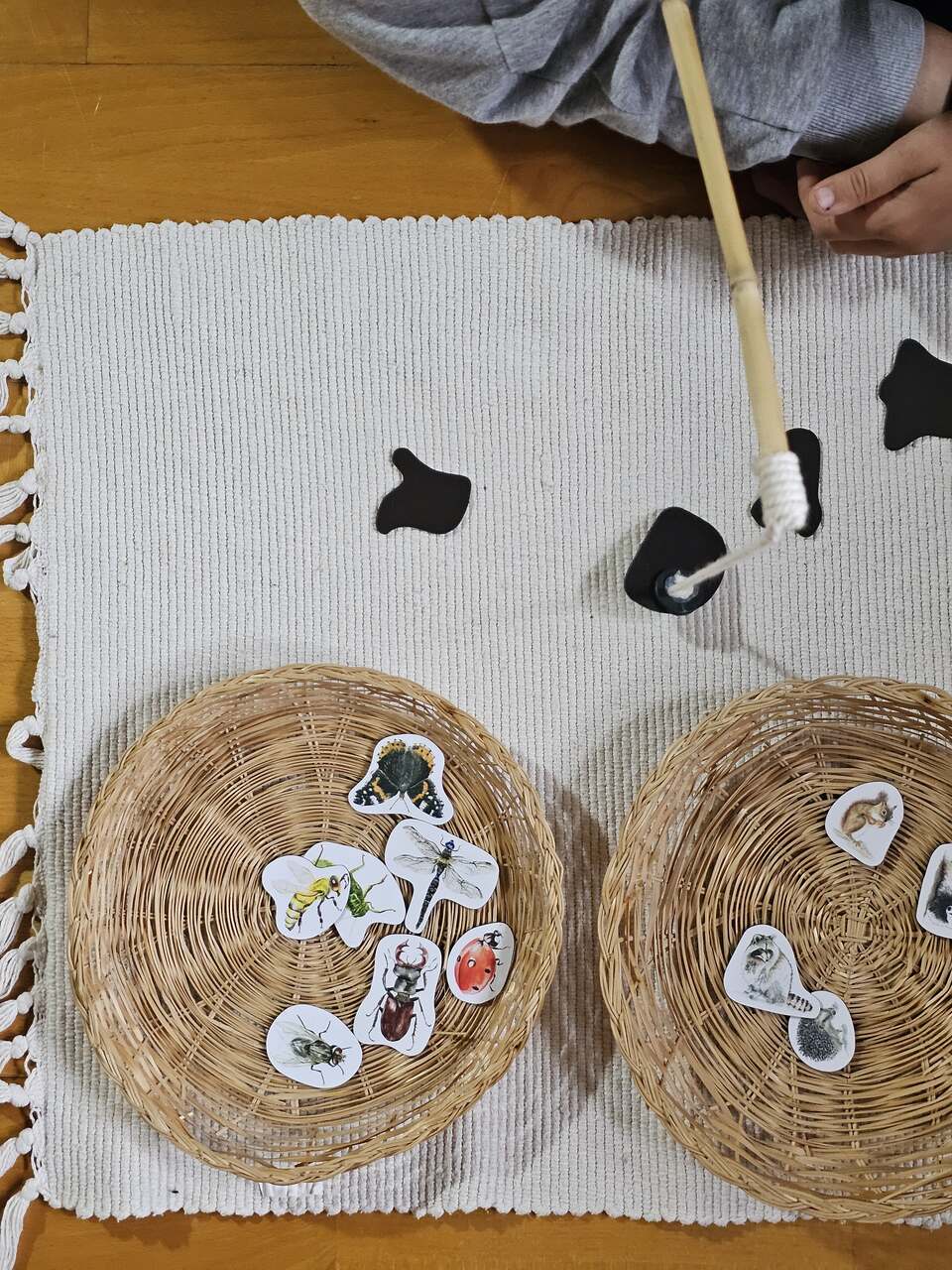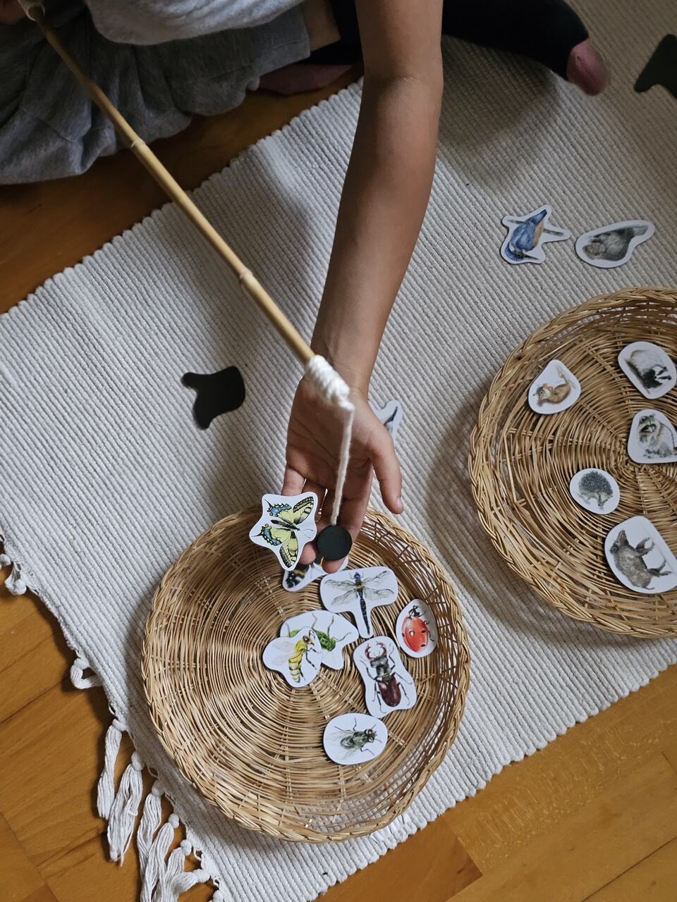 Przygotuj tyle samo koszyczków/pojemników ile jest kategorii magnesów. Możesz ułożyć też na podłodze pętle ze sznurka. Zadaniem dziecka jest złowienie magnesu i przyporządkowanie go do odpowiedniej kategorii.