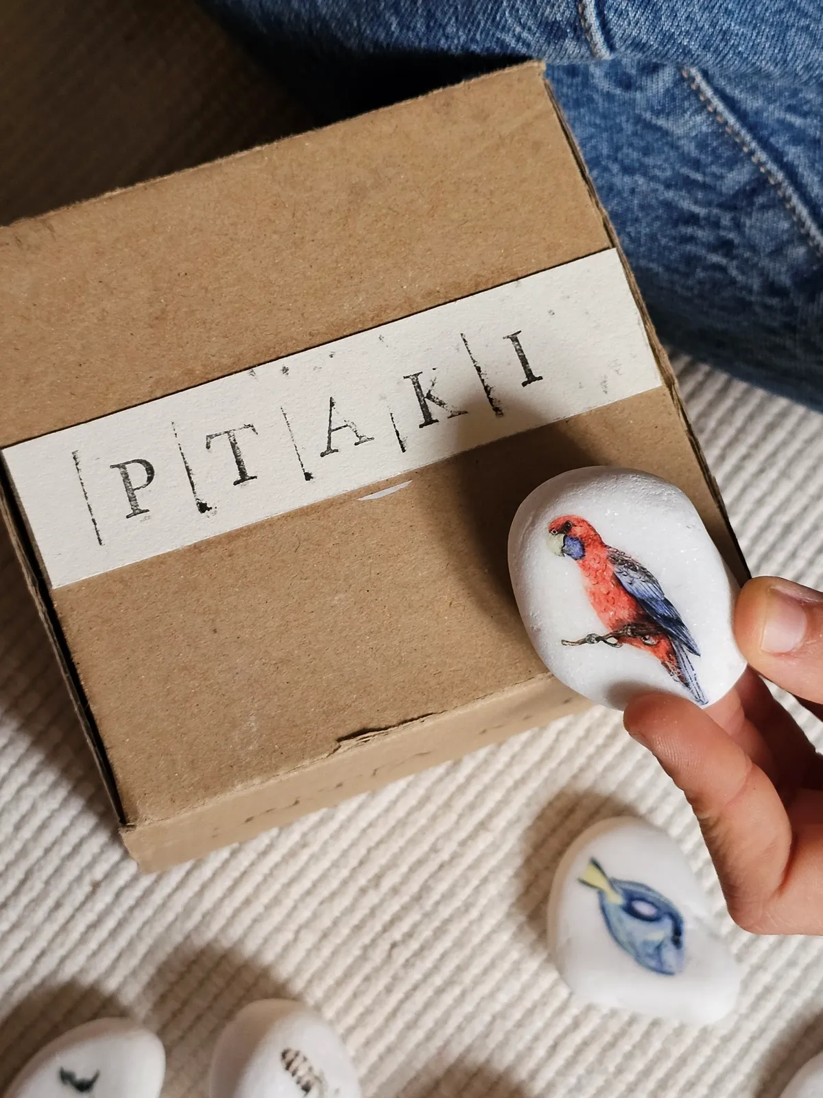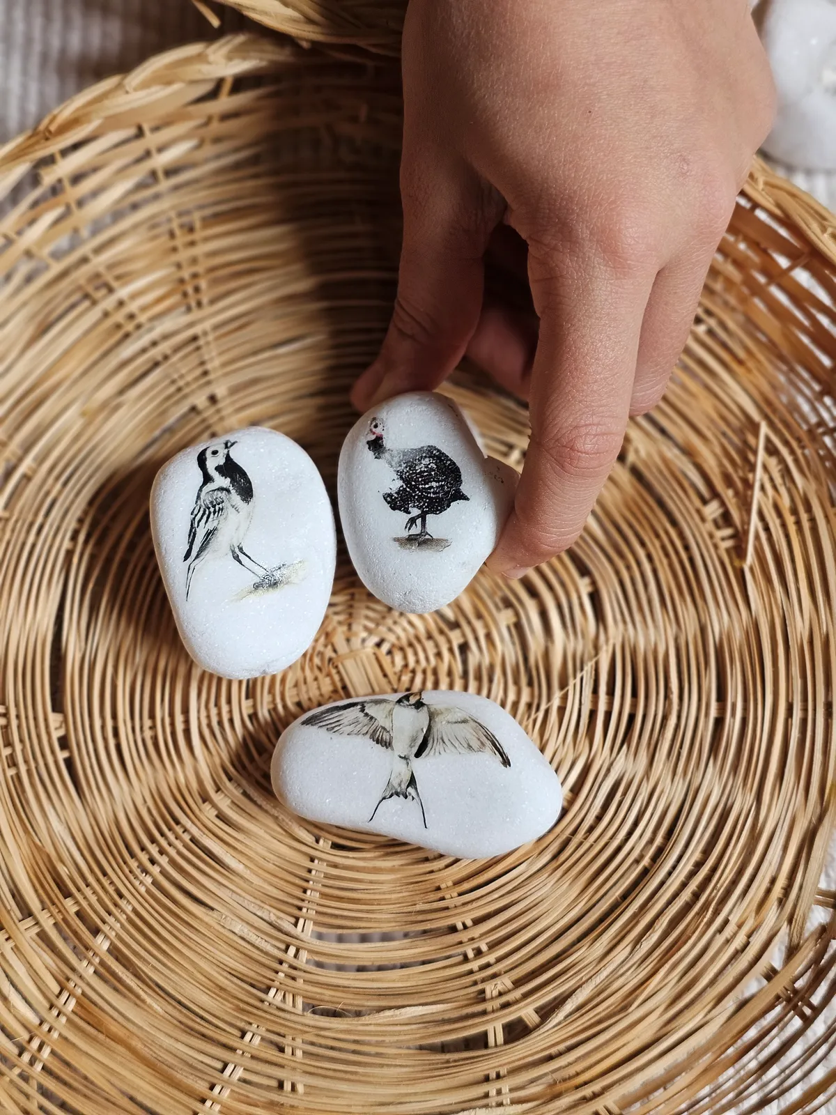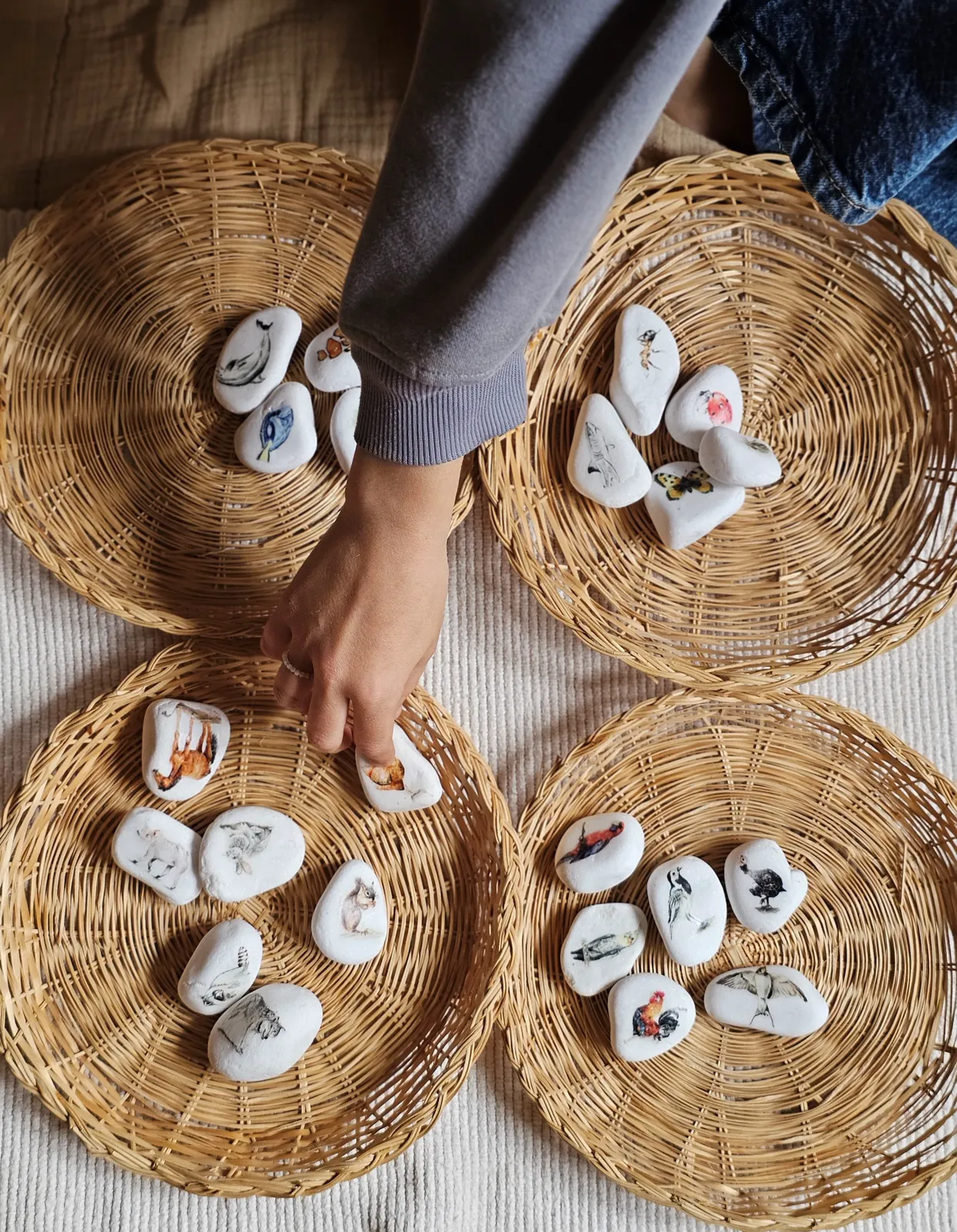 W drugiej części zabawy możesz zaproponować dzieciom segregację gatunków zwierząt. Przygotuj koszyki/pojemniki opatrzone nazwami: PTAKI, SSAKI, RYBY, OWADY. Każde dziecko musi przyporządkować swoje kamienie do odpowiednich pojemników.