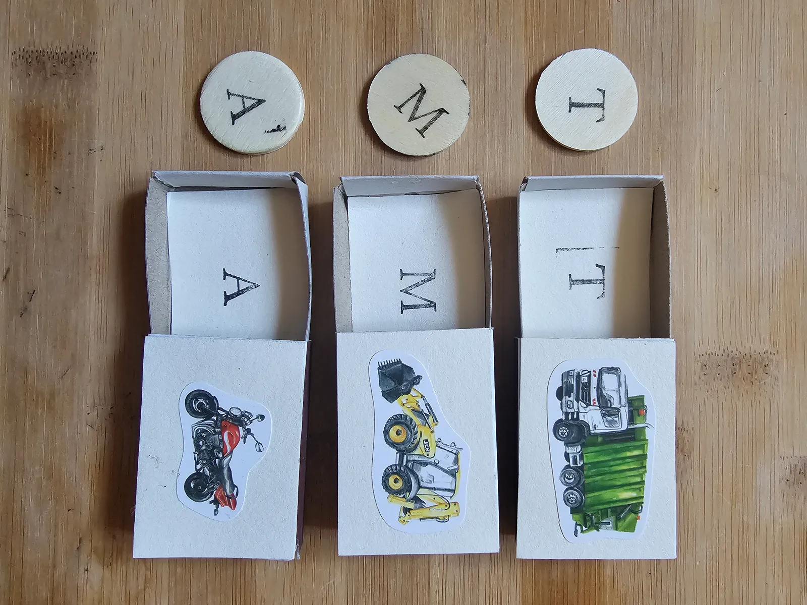 W każdym pudełku po zapałkach umieść karteczkę z napisaną literą alfabetu. Rozsyp małe, drewniane literki ze sklejki (lub drewniane kółeczka na których napiszesz litery). Zadaniem dziecka jest zebranie liter, które odpowiadają tym ukrytym w szufladkach pudełek i umieszczenie ich w środku.