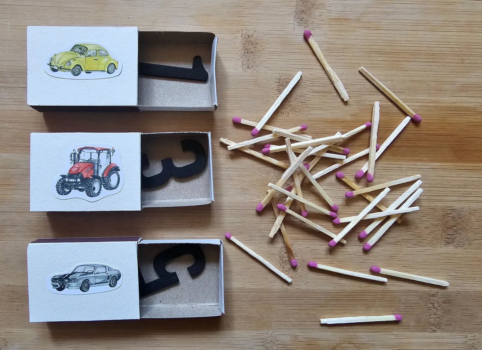 W pudełkach po zapałkach ukryj cyferki ze sklejki, takie same cyferki rozsyp na podłodze. Zadaniem dziecka jest zebranie cyfr, które pasują do tych ukrytych w szufladkach i umieszczenie ich w środku pudełka. Możesz też rozsypać zapałki, wtedy zadaniem dziecka jest zebranie tylu zapałek ile wskazuje cyfra w szufladce.