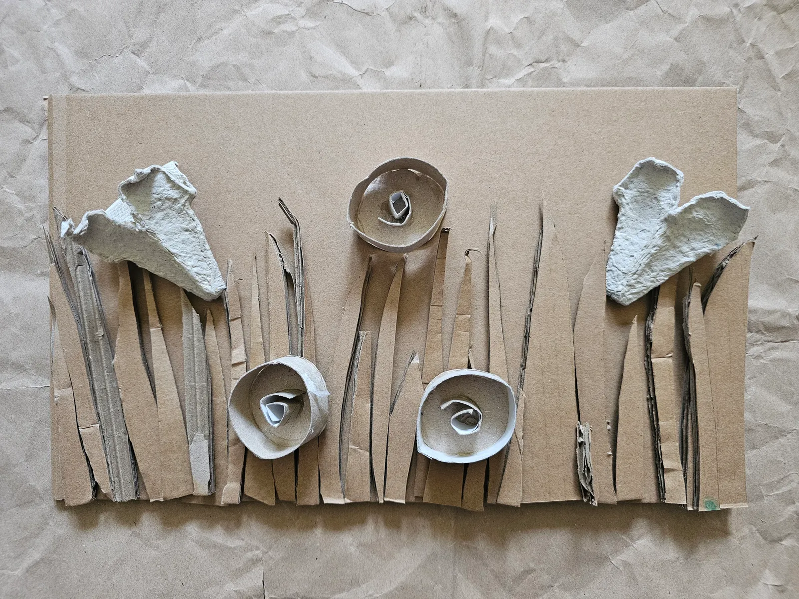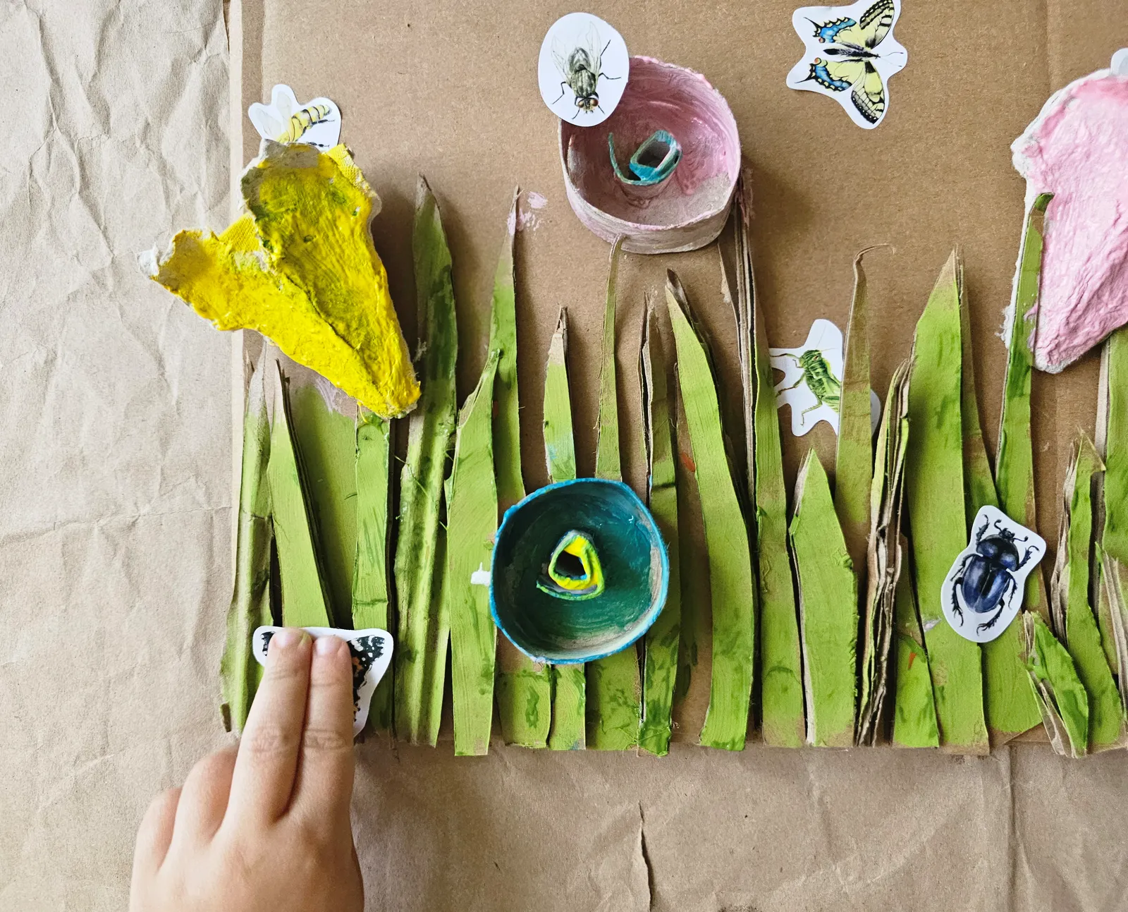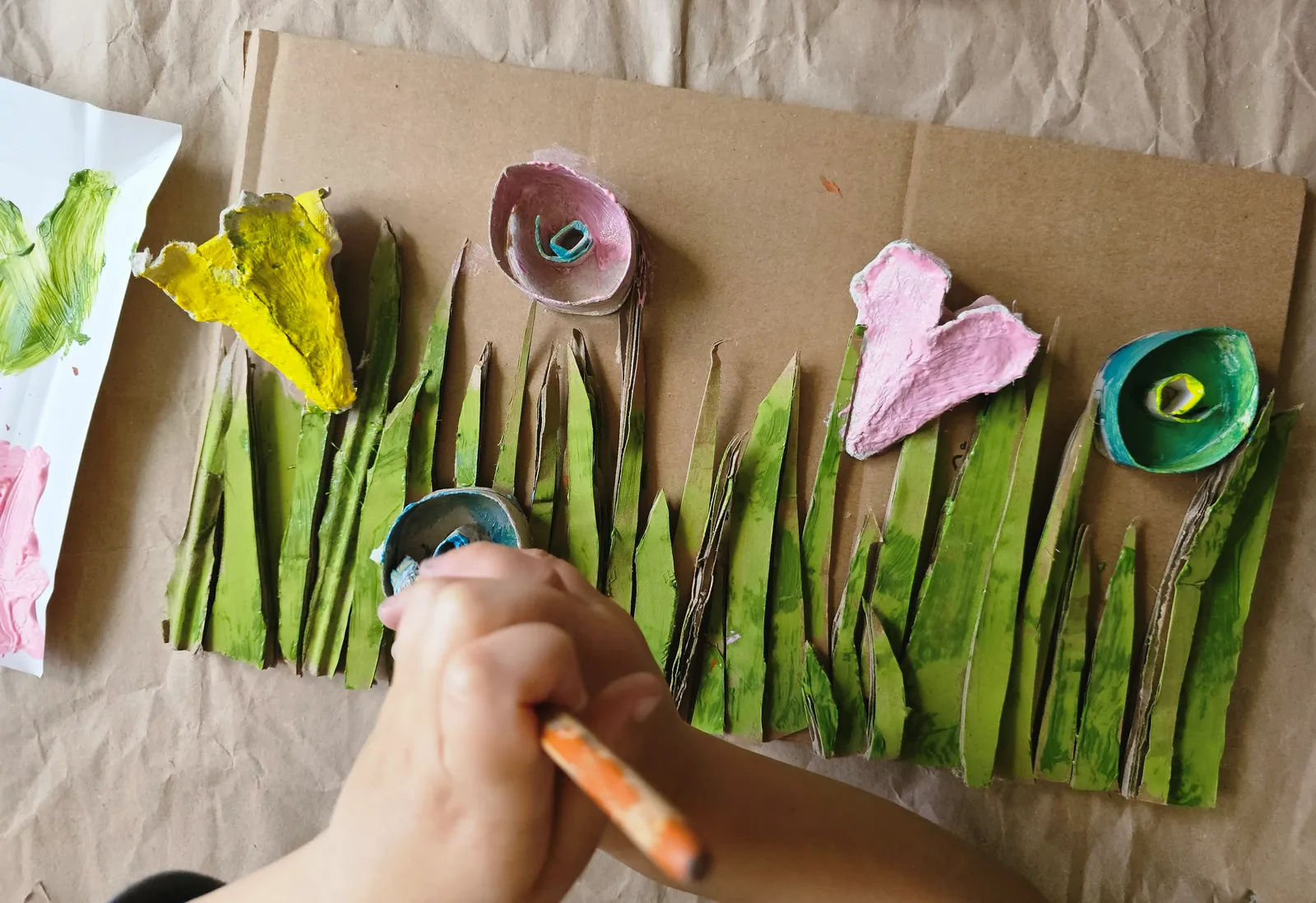 Przygotuj tło - kawałek kartonu, na którym przykleisz trawę i kwiaty. Trawa to wycięte z tektury paski, kwiaty – części wytłoczki po jajkach lub inne fikuśne kształty, które podpowie Ci wyobraźnia. Możesz do zrobienia kwiatów użyć rolek po papierze toaletowym, pasków tektury zwiniętych w ślimaczki.
