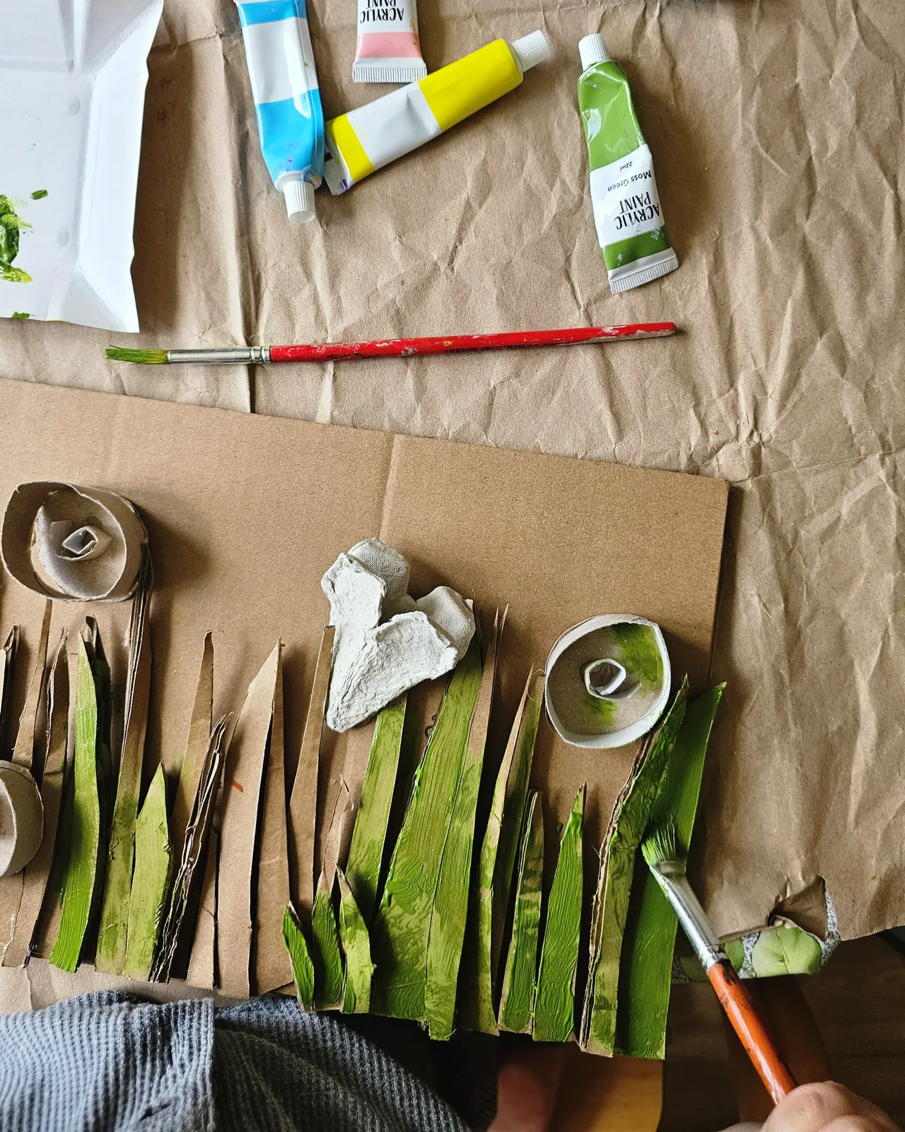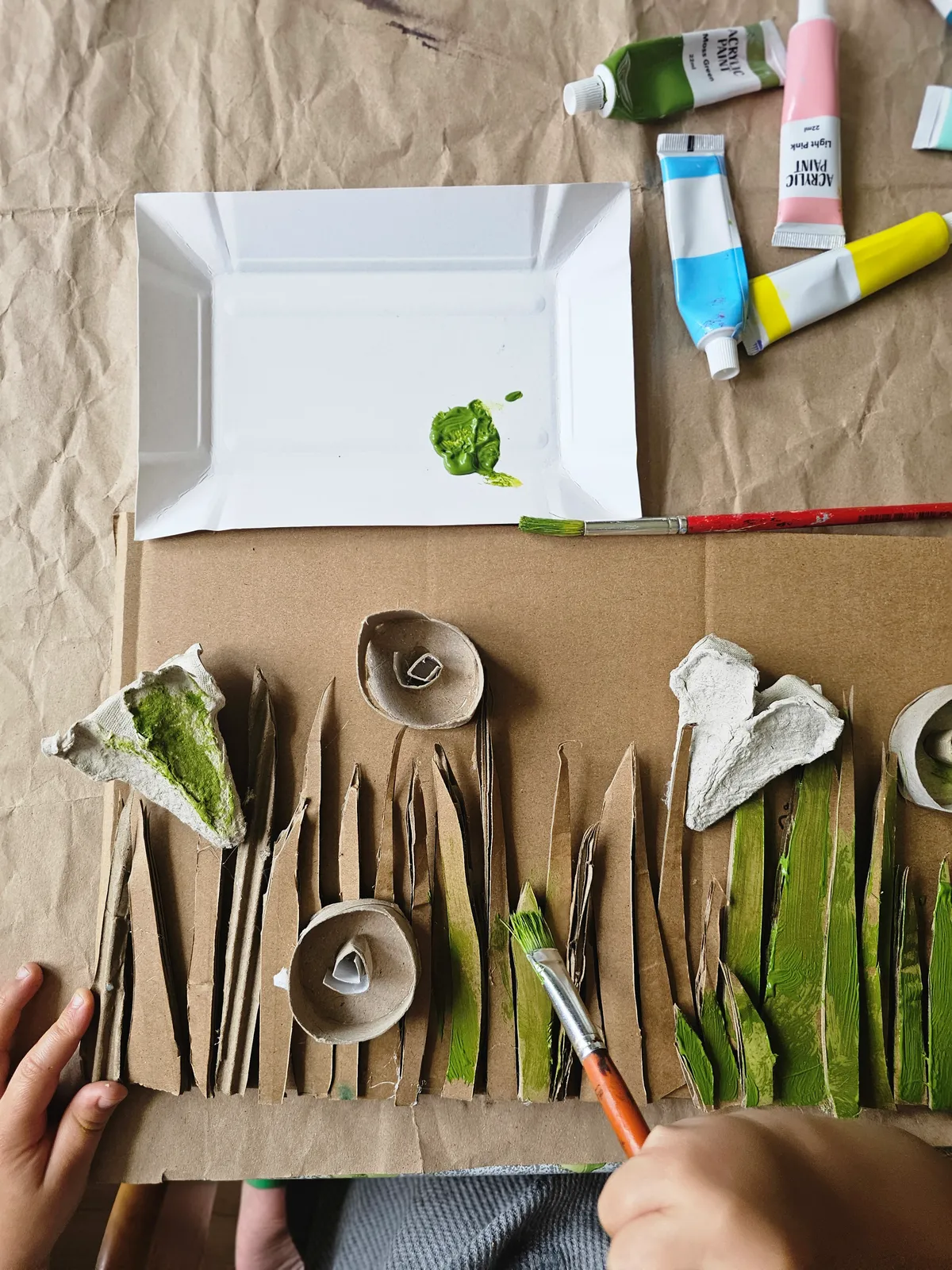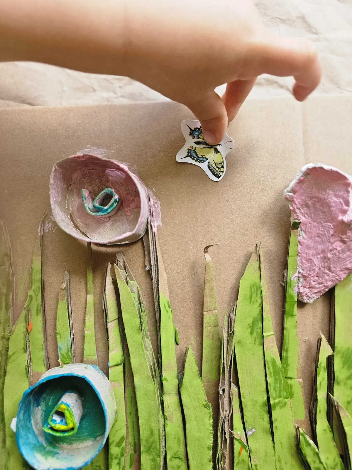 Przygotuj tło - kawałek kartonu, na którym przykleisz trawę i kwiaty. Trawa to wycięte z tektury paski, kwiaty – części wytłoczki po jajkach lub inne fikuśne kształty, które podpowie Ci wyobraźnia. Możesz do zrobienia kwiatów użyć rolek po papierze toaletowym, pasków tektury zwiniętych w ślimaczki.