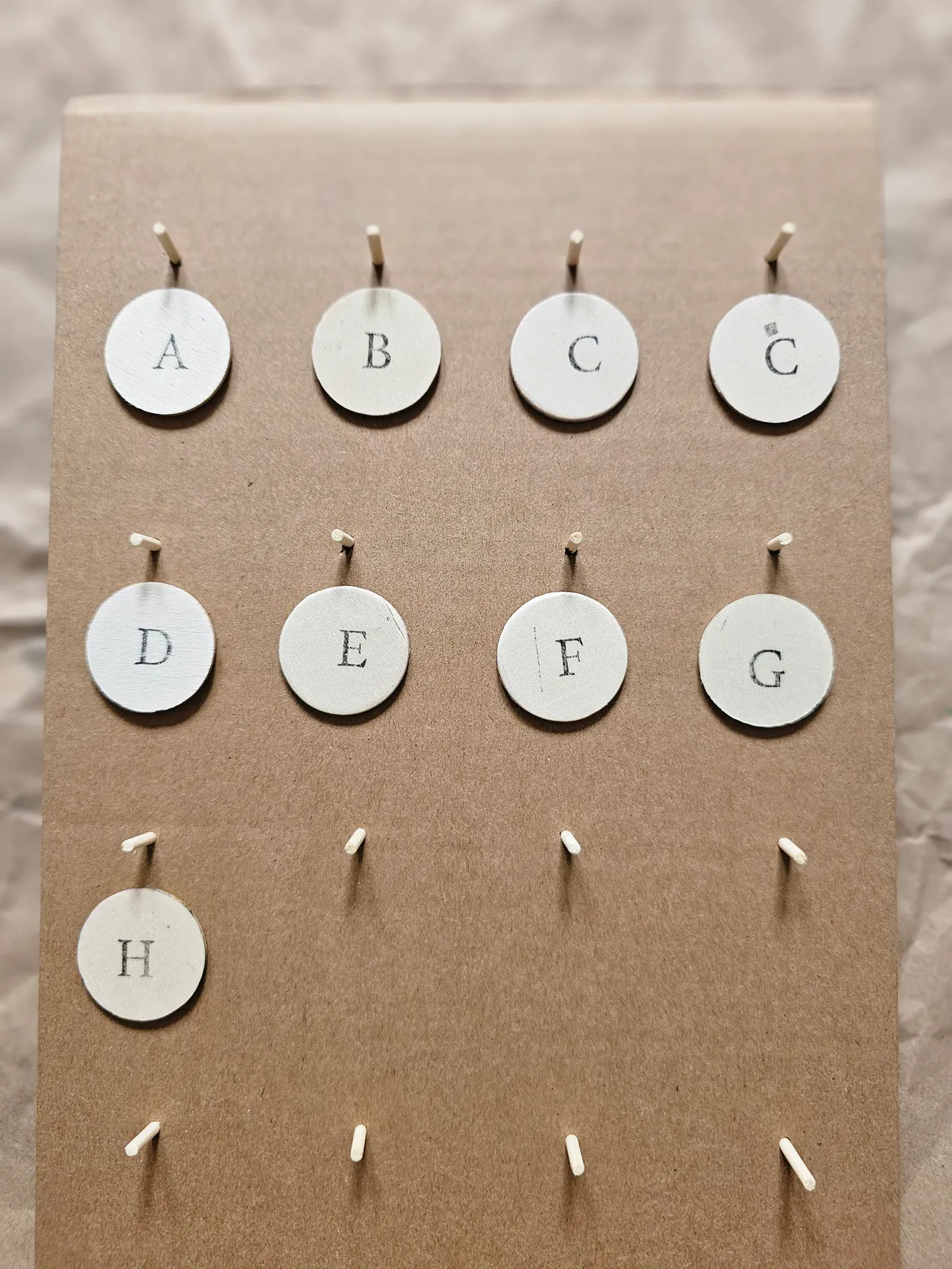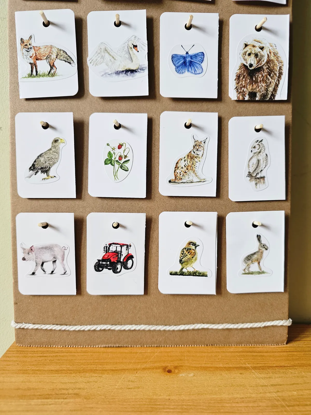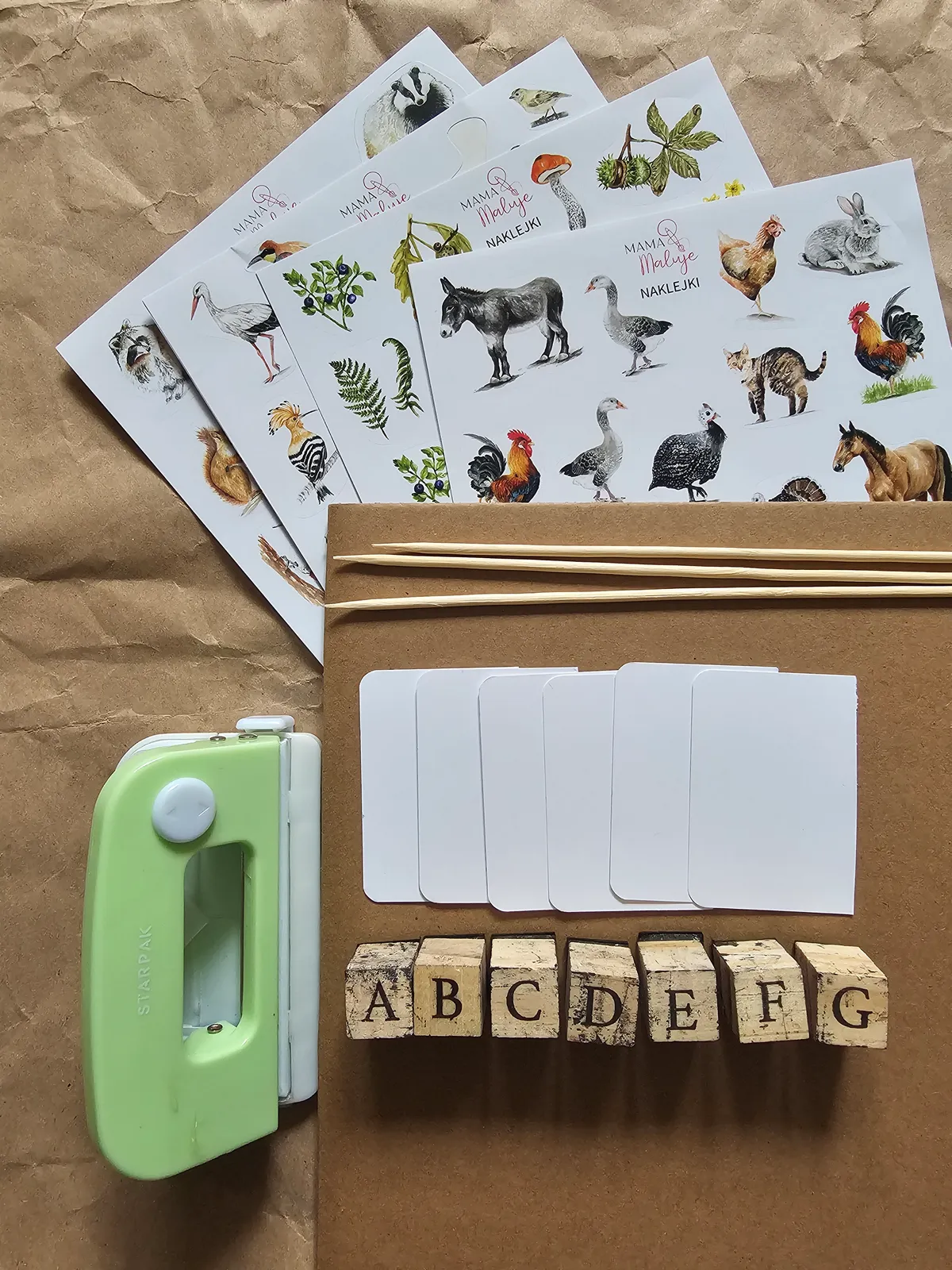 Przygotuj kartoniki z ilustracjami – wytnij z bloku prostokąty o wielkości 4/6 cm, w każdym zrób dziurkaczem dziurkę. Na kartonikach umieść naklejki z ilustracjami, których nazwy zaczynają się na konkretne litery alfabetu (A jak auto, B jak biedronka itp.) Rozłóż obrazki na grubym kartonie, zrób wykałaczką dziurki w miejscu gdzie będą uchwyty do ich powieszenia. Długie wykałaczki potnij na krótkie kawałki, każdy taki „kołek” umieść w dziurce (dla trwalszego efektu możesz użyć kleju magicznego).