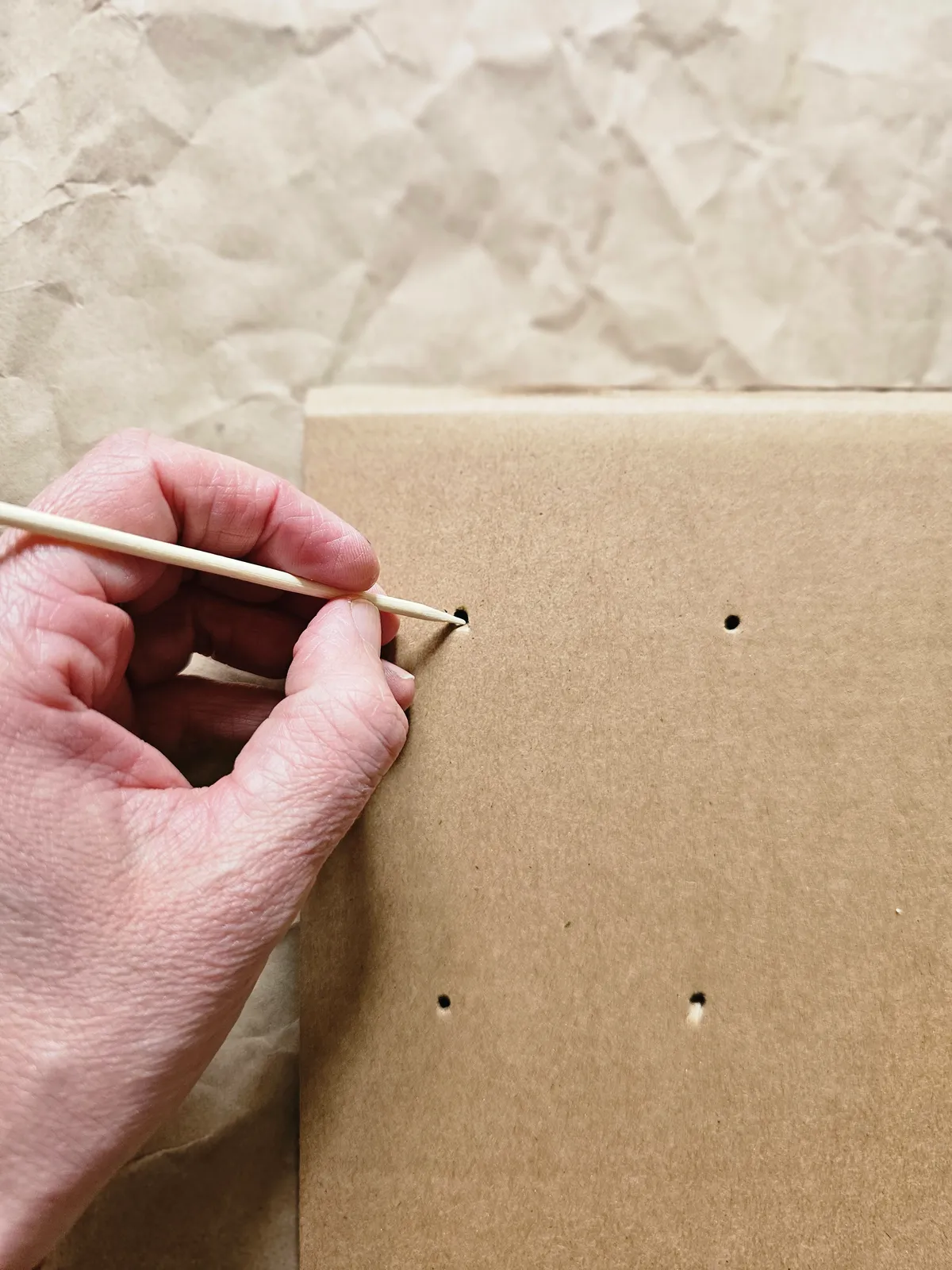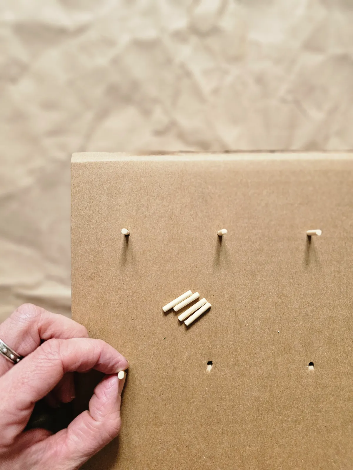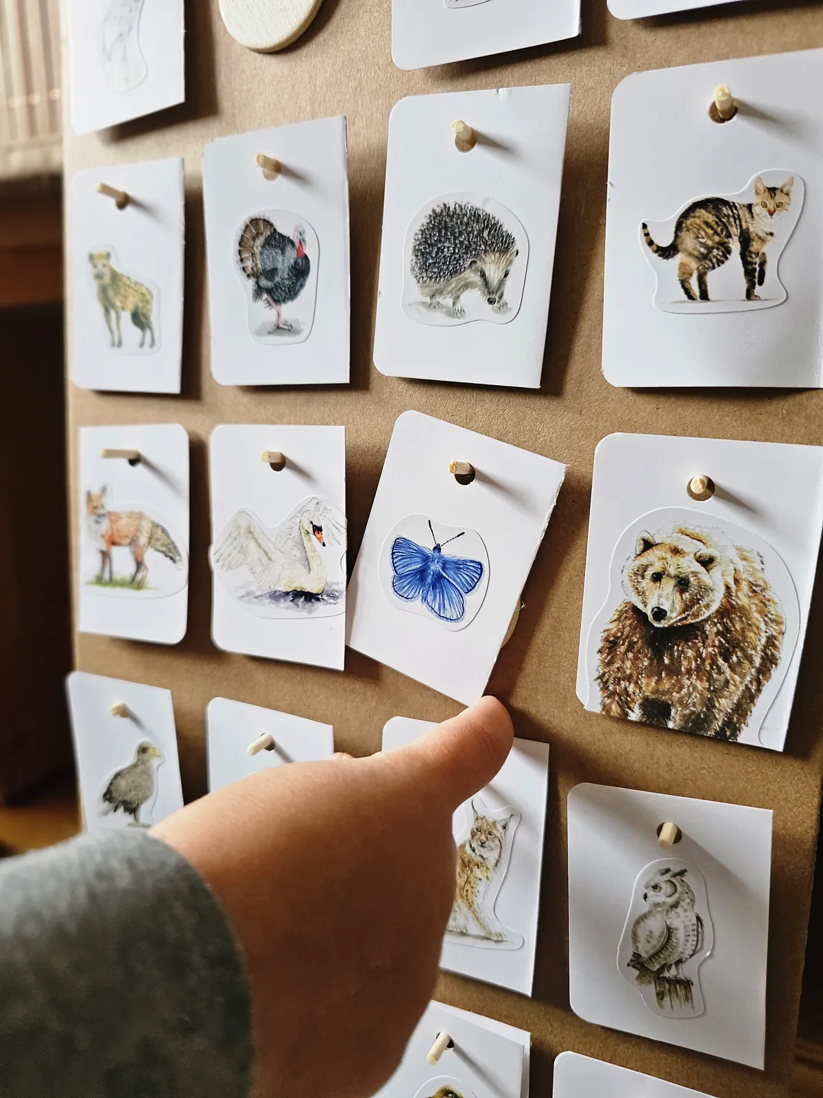 Przygotuj kartoniki z ilustracjami – wytnij z bloku prostokąty o wielkości 4/6 cm, w każdym zrób dziurkaczem dziurkę. Na kartonikach umieść naklejki z ilustracjami, których nazwy zaczynają się na konkretne litery alfabetu (A jak auto, B jak biedronka itp.) Rozłóż obrazki na grubym kartonie, zrób wykałaczką dziurki w miejscu gdzie będą uchwyty do ich powieszenia. Długie wykałaczki potnij na krótkie kawałki, każdy taki „kołek” umieść w dziurce (dla trwalszego efektu możesz użyć kleju magicznego).