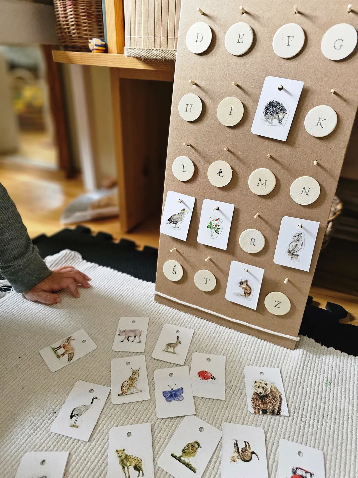 Można też bawić się tak: umieść wcześniej wszystkie obrazki na właściwych miejscach a zadaniem dziecka jest odgadnięcie jaka literka kryje się pod spodem.