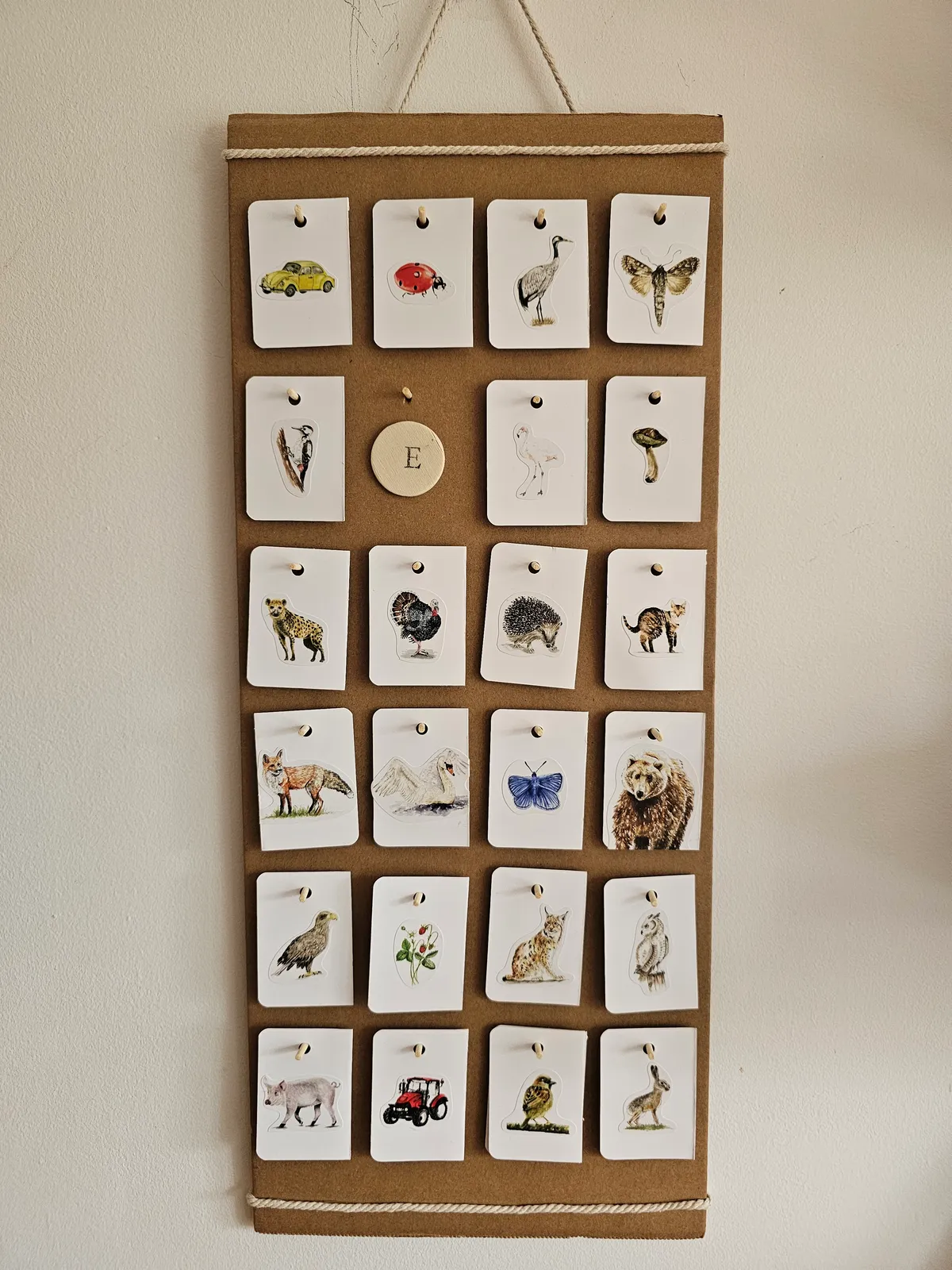 Taką „tablicę” można zawiesić w widocznym i dostępnym miejscu w pokoju dziecka (lub w klasie), by mogło sobie samo zdejmować i zawieszać obrazki. A może przygotujecie tych kartoników więcej i powstaną na nich autorskie rysunki przedmiotów/zwierząt/roślin, które zaczynają się na daną literę?