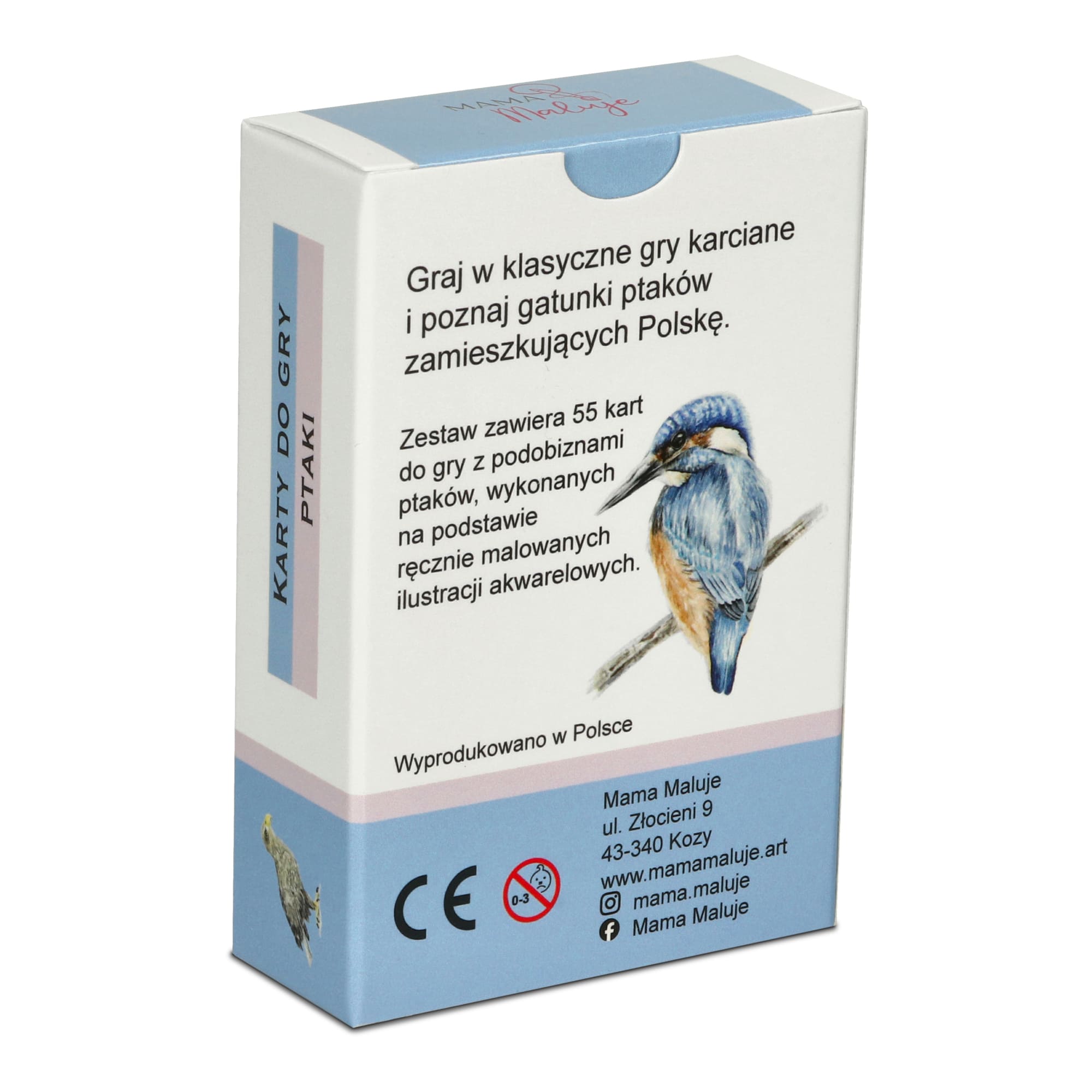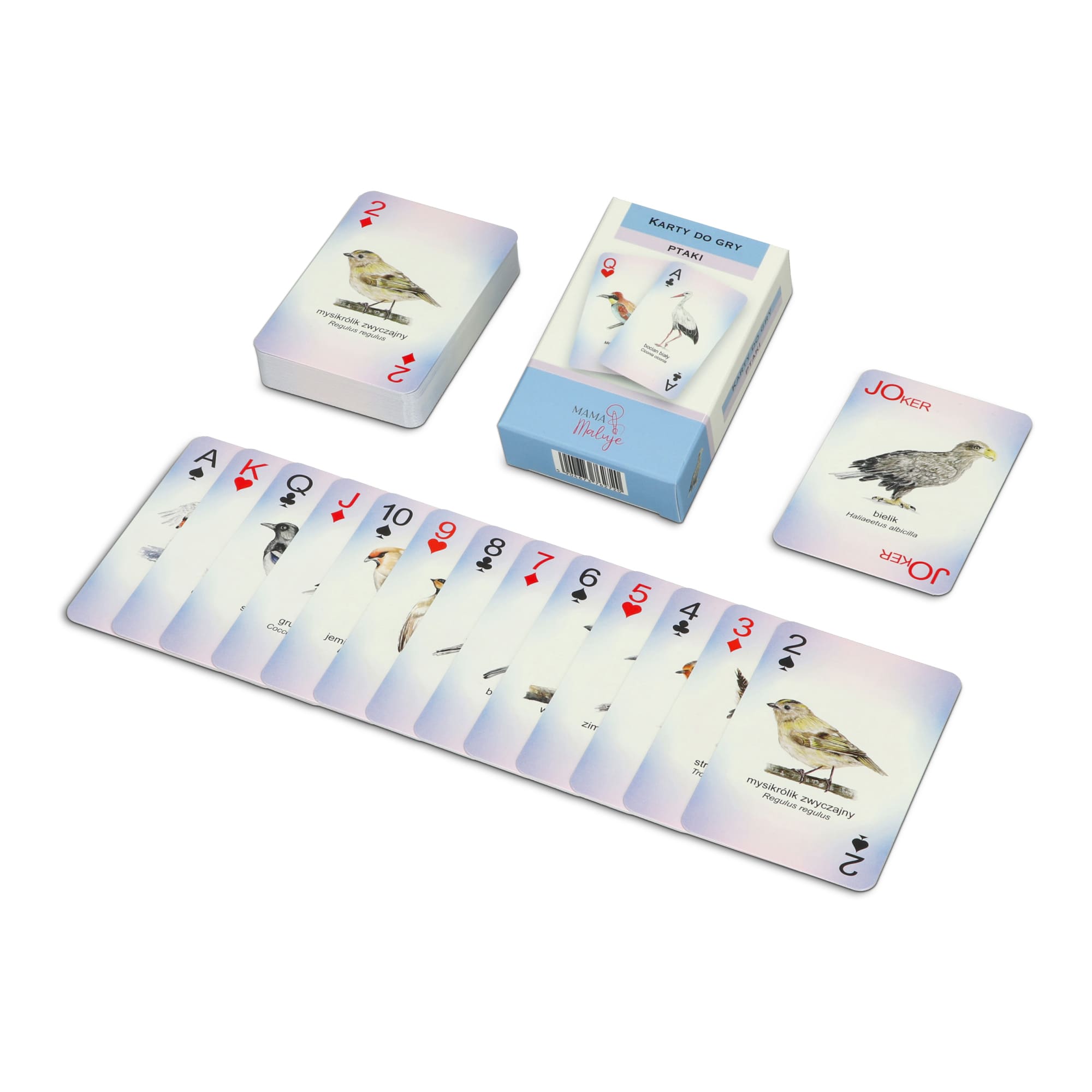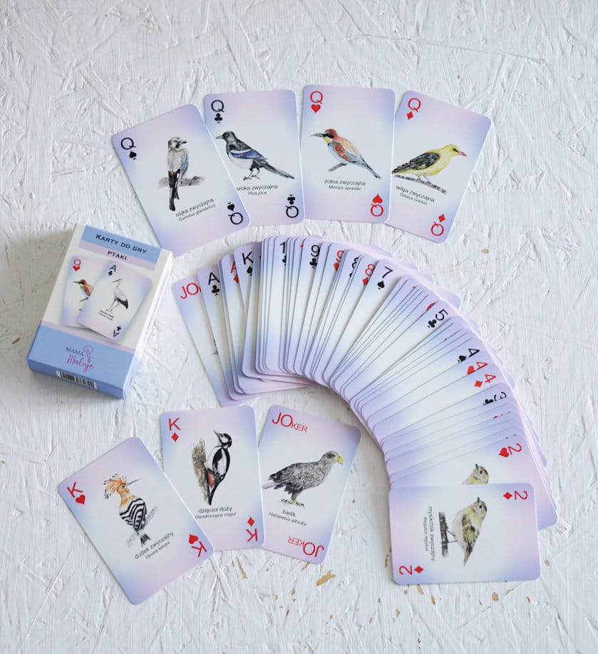 Zestaw zawiera 55 kart do gry z podobiznami ptaków, wykonanych na podstawie ręcznie malowanych ilustracji akwarelowych.