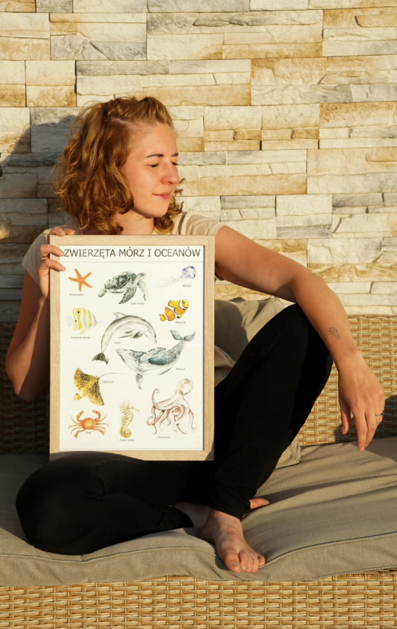 Plakat w formacie A3 lub A4, przedstawiający 11 zwierząt zamieszkujących morza i oceany.